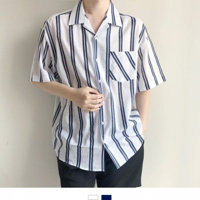 화이트네이비 스트라이프 린넨 남자반팔셔츠